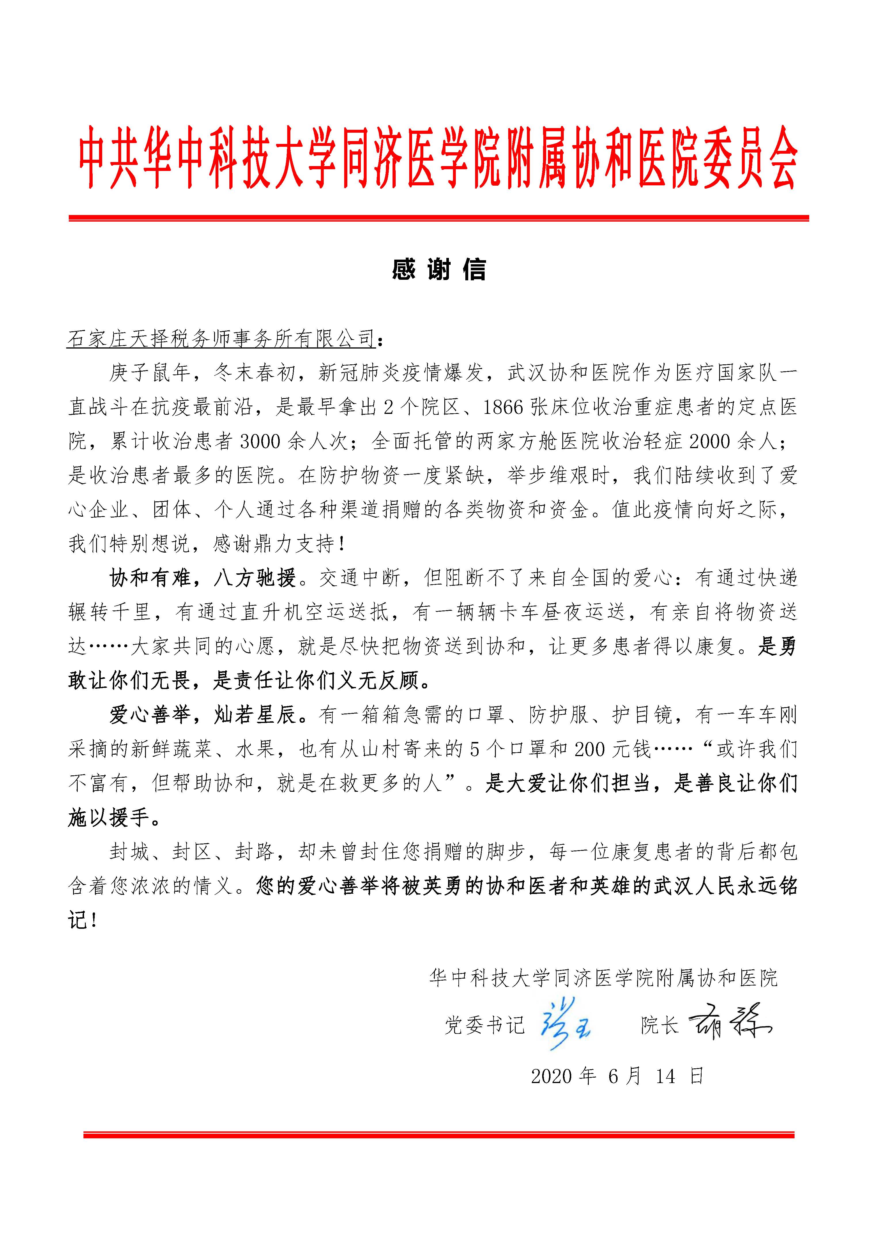 中共華中科技大學(xué)同濟(jì)附屬協(xié)和醫(yī)院委員會感謝信